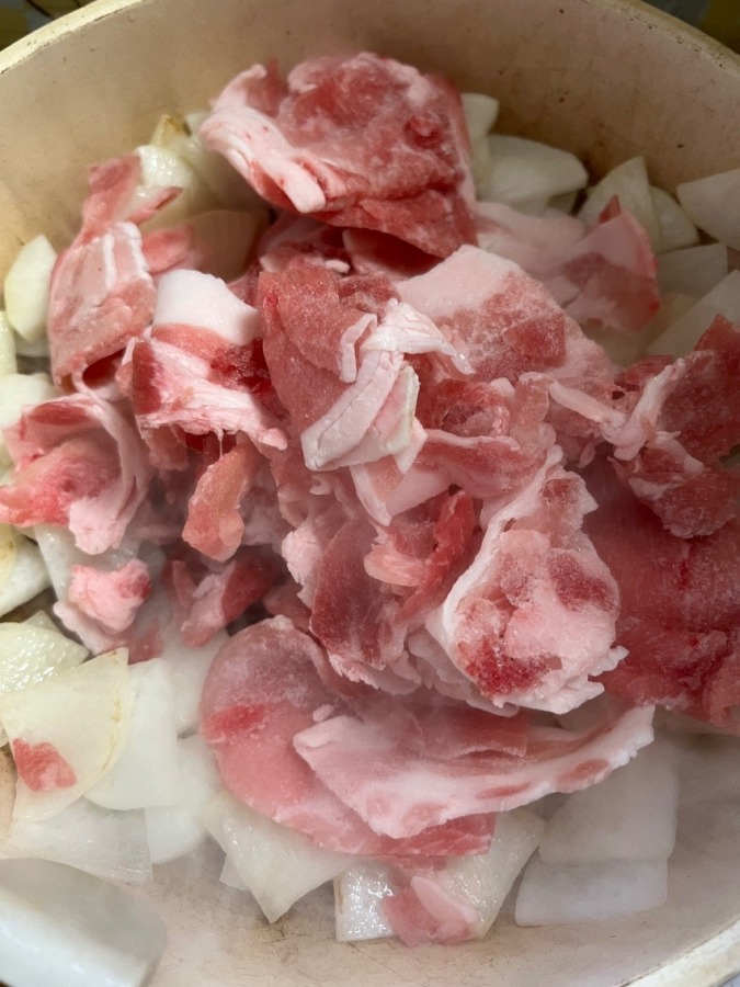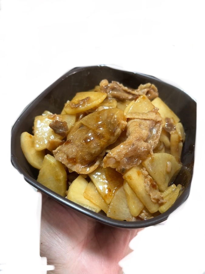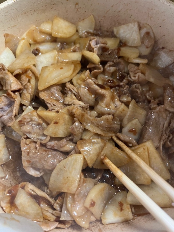 戴いたお肉🥩を使い、大根半分と甘辛炒めにしてみました😁